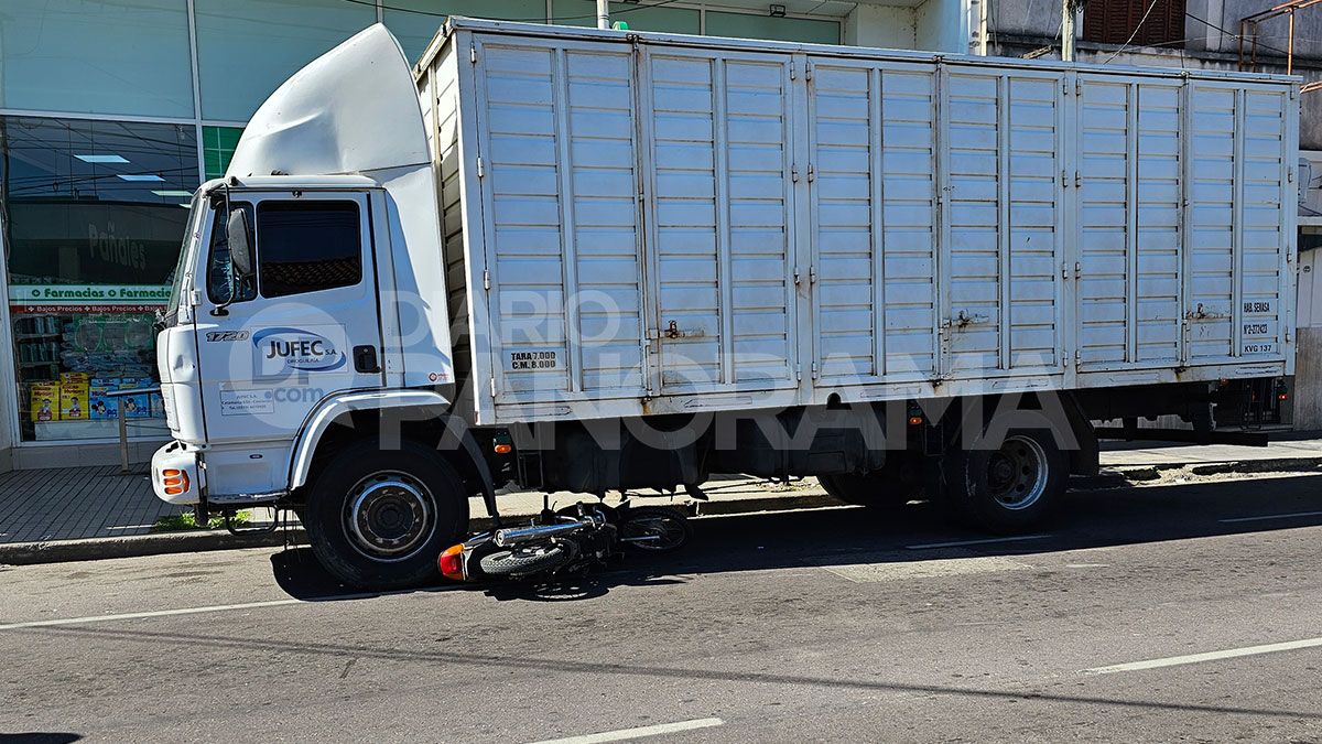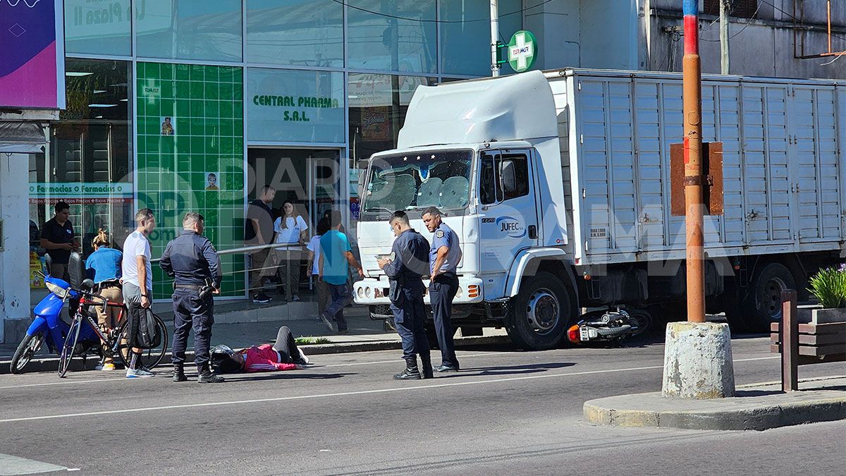 Alrededor de las 15 horas de este sábado, un violento accidente de tránsito tuvo lugar en plena avenida Belgrano, en donde una motociclista resultó lesionada y su rodado terminó debajo de un camión.