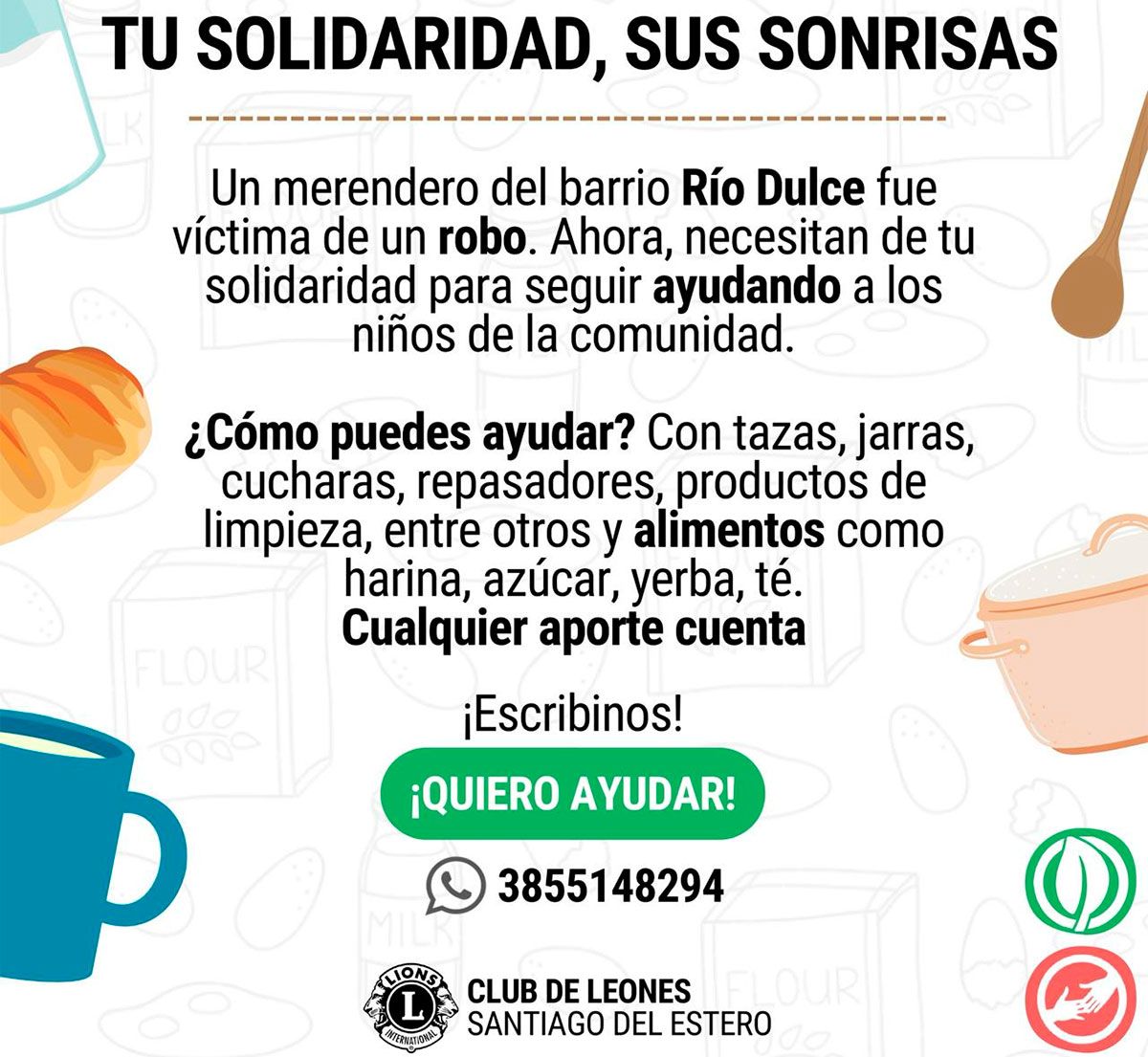 El Club de Leones “Santiago del Estero” anunció el lanzamiento de su campaña “Tu solidaridad, sus sonrisas”. La iniciativa surge como respuesta a un reciente incidente que afectó al merendero del barrio Río Dulce, el cual fue víctima de un robo. En este momento crucial, el merendero requiere el apoyo solidario de la comunidad santiagueña para continuar brindando asistencia a los niños de la zona.