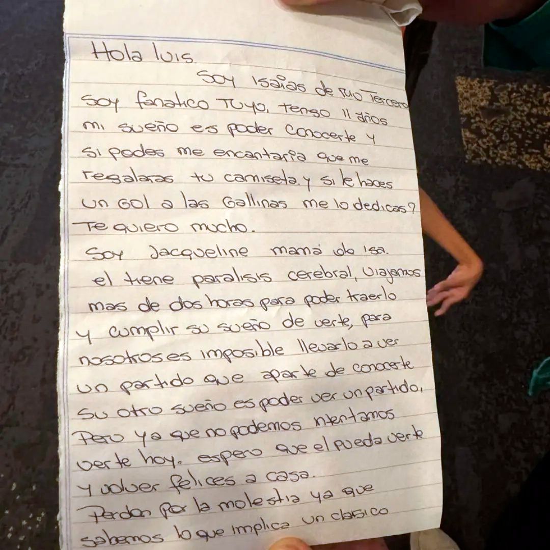 "Hola Luis. Soy Isaías de Río Tercero. Soy fanático tuyo. Tengo 11 años y mí sueño es poder conocerte y si podes me encantaría que me regalaras tu camiseta. Y si le hacés un gol a las gallinas ¿Me lo dedicás? Te quiero mucho", reza el escrito del pequeño.