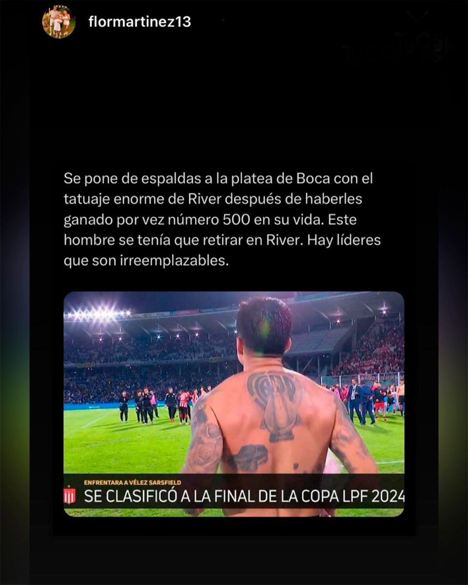 Florencia Martínez, pareja de Enzo Pérez, compartió un posteo de una cuenta de fanáticos de River en el que se ve al experimentado mediocampista con su tatuaje en toda la espalda alta del escudo del club y la virgen, acompañado del siguiente comentario: "Se pone de espaldas a la platea de Boca con el tatuaje enorme de River después de haberles ganado por vez número 500 en su vida. Este hombre se tenía que retirar en River. Hay líderes que son irremplazables". Claro, ¿no?