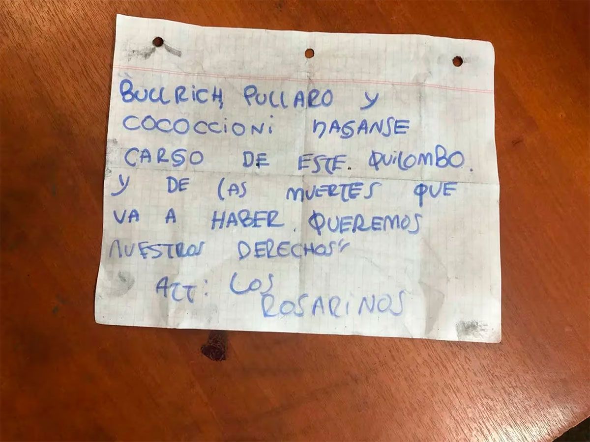 En la misma cuadra, Ingeniero White al 7600 -zona oeste de la ciudad-, apareció otra nota a metros de un jardín de infantes. “Esto es por ustedes. Háganse cargo. Va a empezar a morir gente inocente”, decía. Ambos mensajes llevan la firma de “Los Rosarinos”.