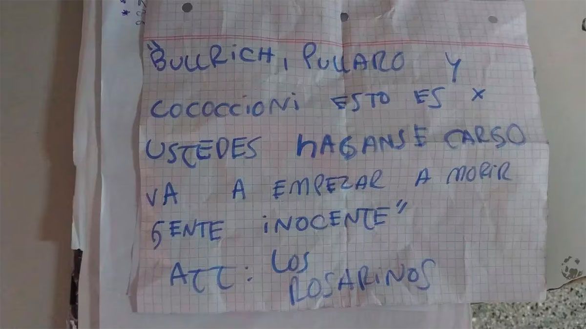 “Una mamá de un alumno que ingresaba a la Escuela N° 1137 nos da cuenta que otra mamá, en horas tempranas, avisa que encontró una nota, por lo que procedemos a entrevistar a quien sería la asistente escolar, dando cuenta lo mencionado anteriormente y haciendo entrega de una hoja papel con la inscripción: BULLRICH, PULLARO Y COCOCCIONI ESTO ES X USTEDES HAGANSE CARGO VA A EMPEZAR A MORIR GENTE INOCENTE. ATT: LOS ROSARINOS”, dice el parte policial en relación a la amenaza encontrada a metros del establecimiento educativo.
