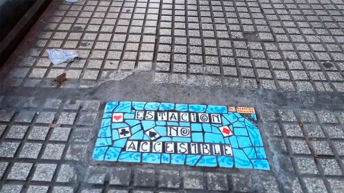 Desde que usa silla de ruedas, Sofía -al igual que todas las personas en la misma condición- no puede usar el subte. Por eso, rellenó el espacio de una baldosa rota junto a la entrada de la estación Río de Janeiro, de la línea A. El mensaje, más directo que los demás, dice: “Estación no accesible”.