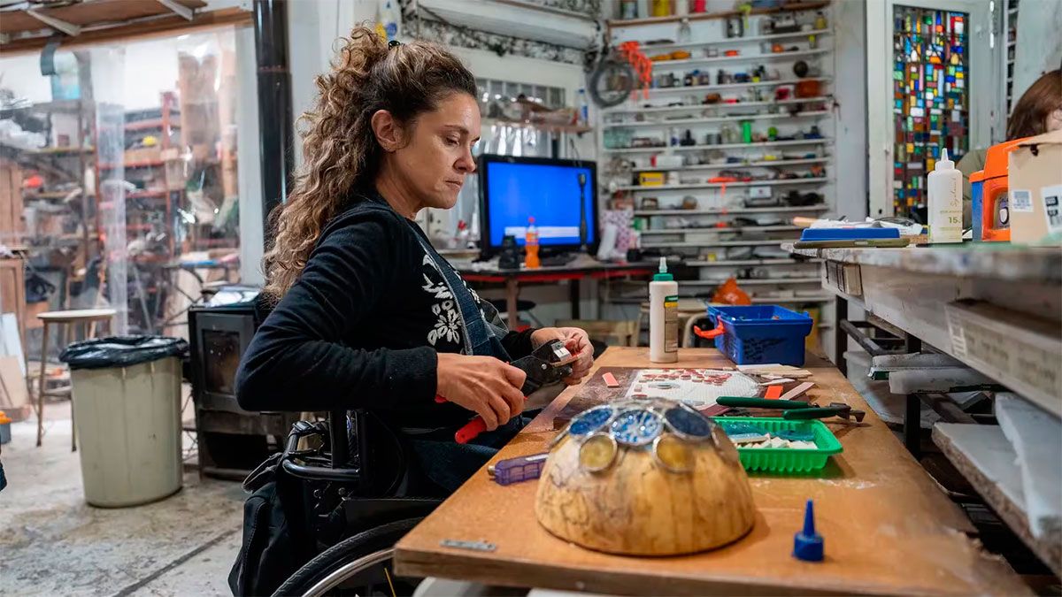 Sufrió un accidente que la dejó en silla de ruedas a los 19 y desde entonces lucha por conquistar espacios. Ahora, arregla las calles y veredas con sus diseños de mosaicos inspirados en “Alicia en el país de las maravillas”.