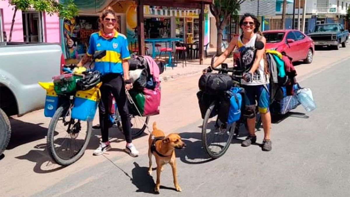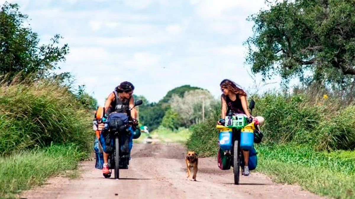 Yvana Sánchez, Julieta Fernández y Chimarrão, su perro, viajan en bicicleta desde la provincia de Buenos Aires hasta Paraguay, y pasaron por la Capital de la Tradición en su camino hacia Chaco para tomar rutas internacionales.