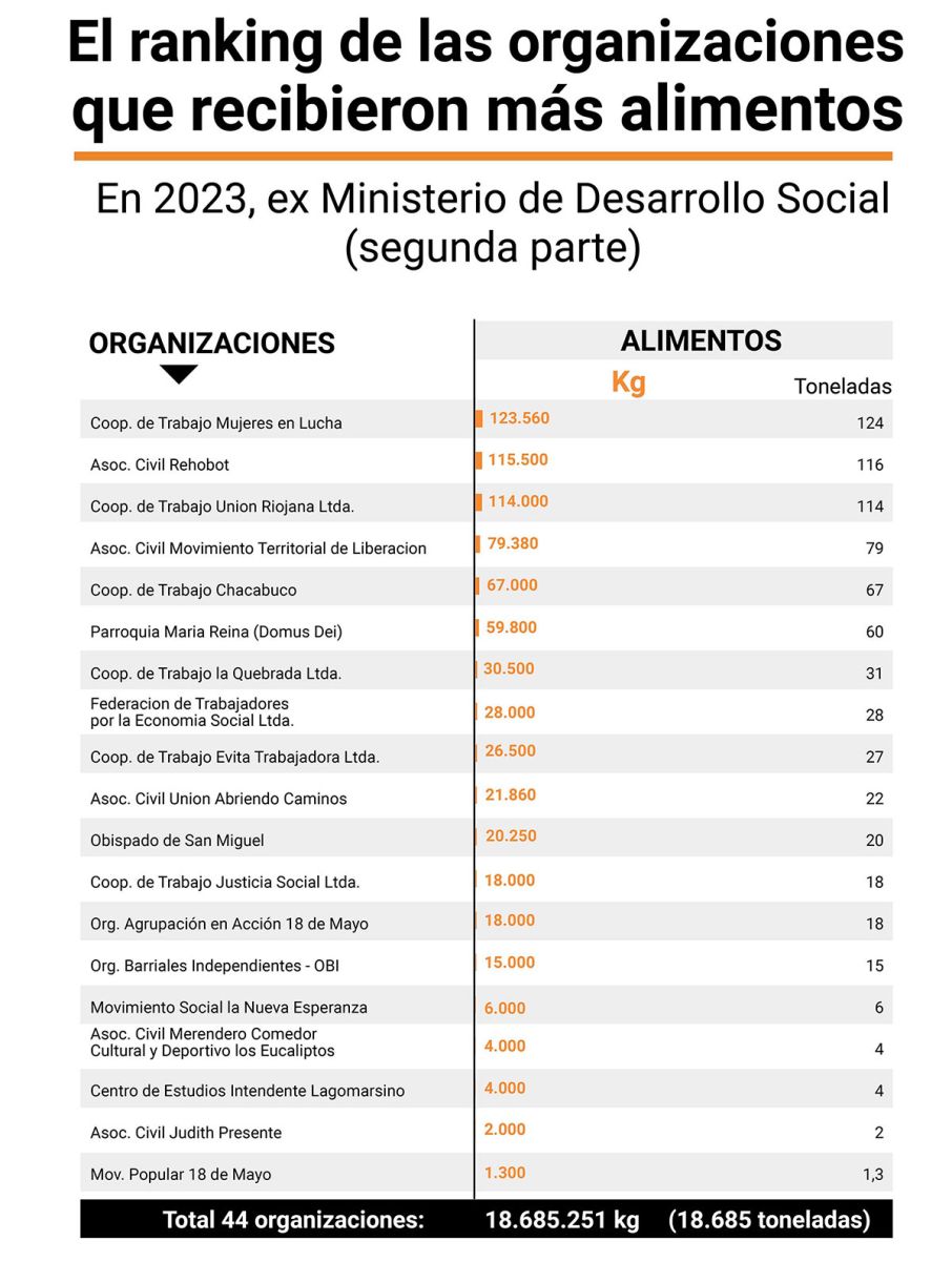 Según la documentación oficial aportada por Capital Humano en los tribunales de Comodoro Py, en 2023, desde el ex Ministerio de Desarrollo Social se derivaron de manera directa a 44 organizaciones 18.685 toneladas de alimento seco. De esa totalidad, la Asociación Civil Polo Obrero recibió casi el 20% 4.618 toneladas. En unidad de transporte, ese volumen de mercadería representa unos 160 contenedores grandes de 12,19 metros de longitud.