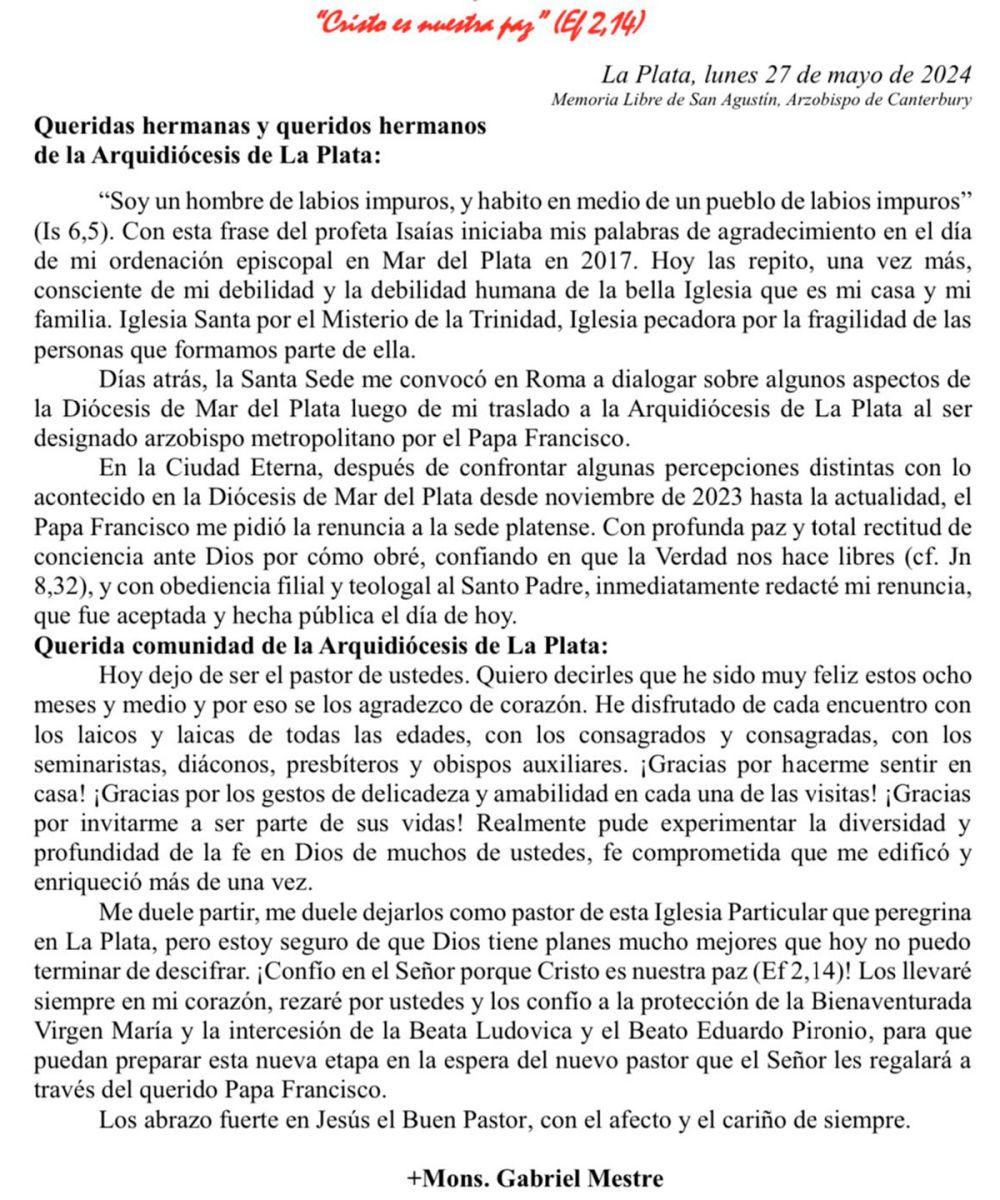 “Días atrás, la Santa Sede me convocó a Roma a dialogar sobre algunos aspectos de la diócesis de Mar del Plata luego de mi traslado a la Arquidiócesis de Mar del Plata al ser designado arzobispo metropolitano por el papa Francisco”, escribió Mestre en la carta.