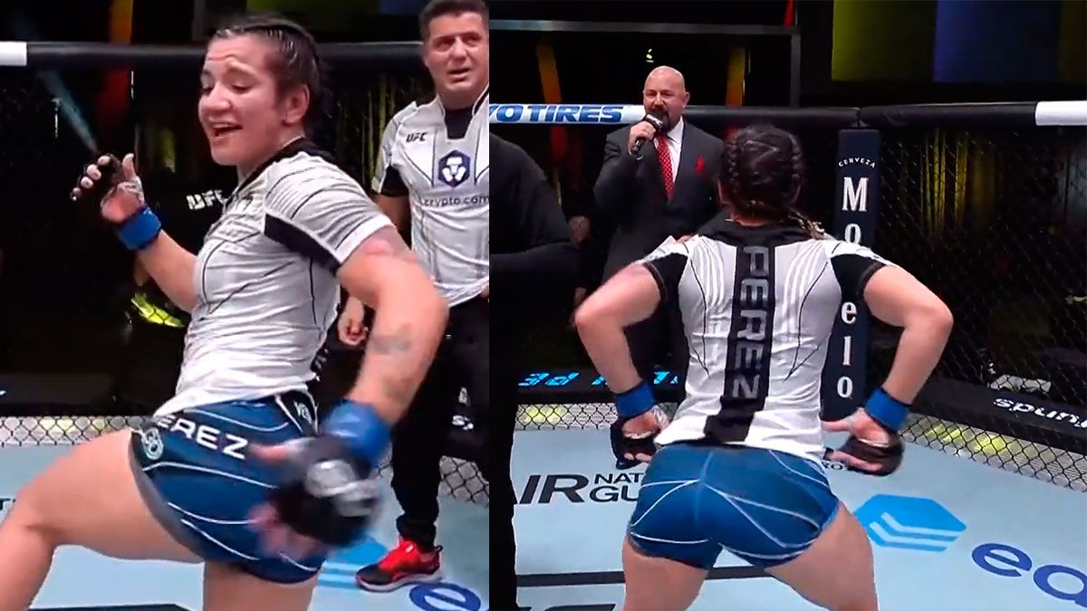 Fiel a su estilo, Pérez celebró su victoria con un baile al estilo twerking, animando a los fanáticos presentes. Incluso trató de hacer bailar a su rival. La escalofriante lesión de Michal Oleksiejczuk.