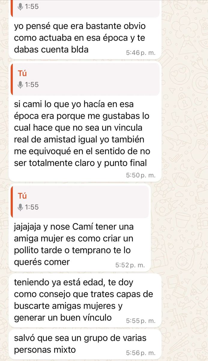 Luego, escribió un mensaje que generó sorpresa entre los internautas: “Cami, tener una amiga mujer es como criar un pollito. Tarde o temprano te lo querés comer”. Seguido a esto, aprovechó para darle una recomendación y le dijo: “Teniendo ya esta edad, te doy como consejo que trates, capaz, de buscarte amigas mujeres y generar un buen vínculo. Salvo que sea un grupo de varias personas mixto”.