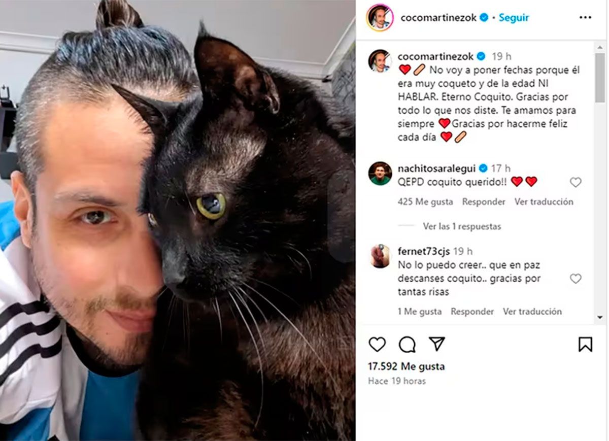 Además del video que dejó a modo de explicación sobre el trágico hecho, también subió un posteo de despedida. Junto a una imagen donde se lo ve con una de sus mascotas, el epígrafe fue el siguiente: “No voy a poner fechas porque él era muy coqueto y de la edad ni hablar. Eterno Coquito. Gracias por todo lo que nos diste. Te amamos para siempre. Gracias por hacerme feliz cada día”.