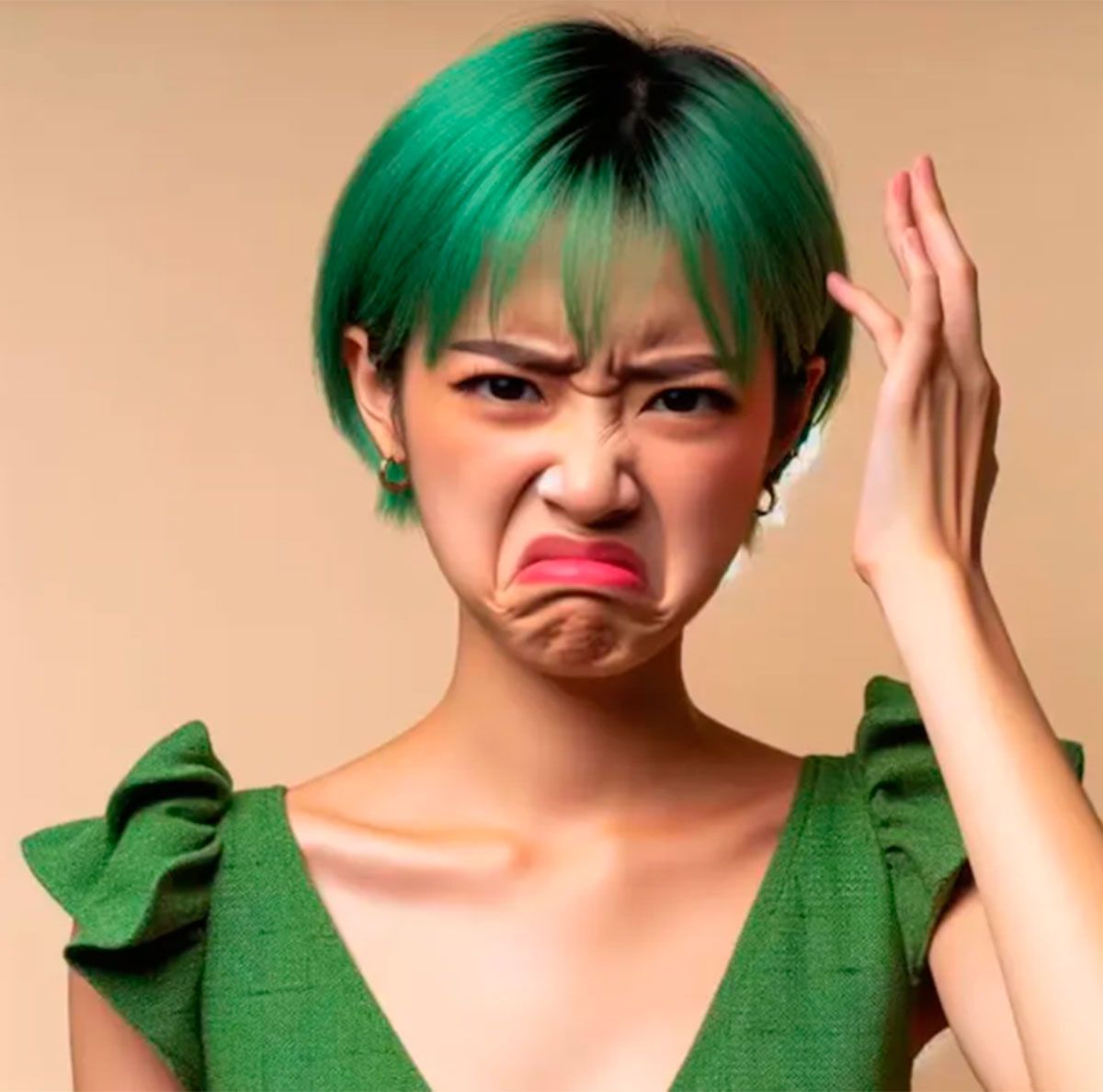 Desagrado, característica por el color verde, es representada por la IA como una joven con pelo corto del mismo color. Se muestra con una expresión de asco fruncida, cejas arqueadas y arrugas en la nariz.