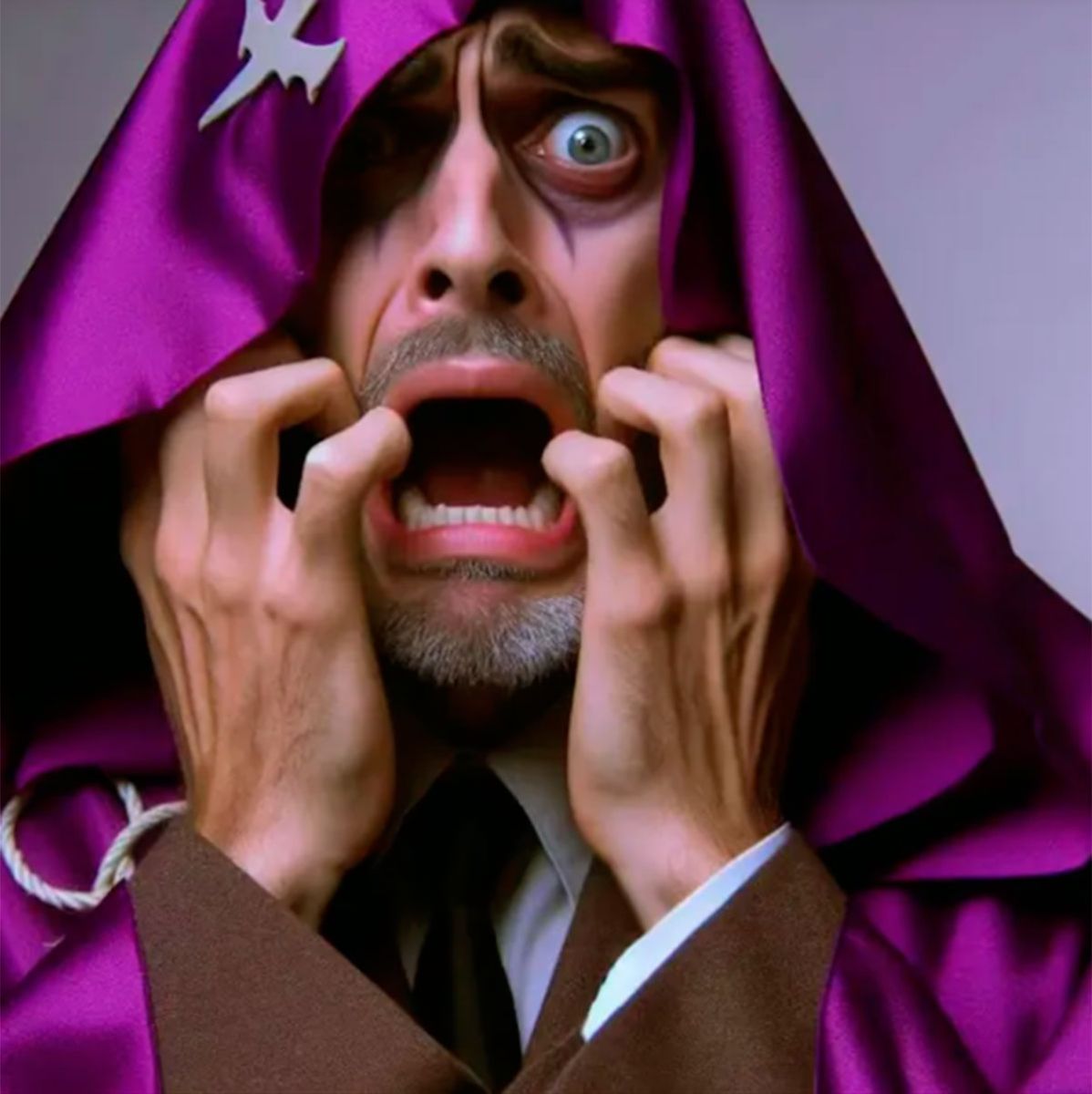 Miedo está asociado con el color violeta. Es personificado por la IA como un hombre con muchas ojeras en pánico. Tiene sus manos a la altura de la boca, abierta como para gritar, y lágrimas corriendo por sus mejillas.
