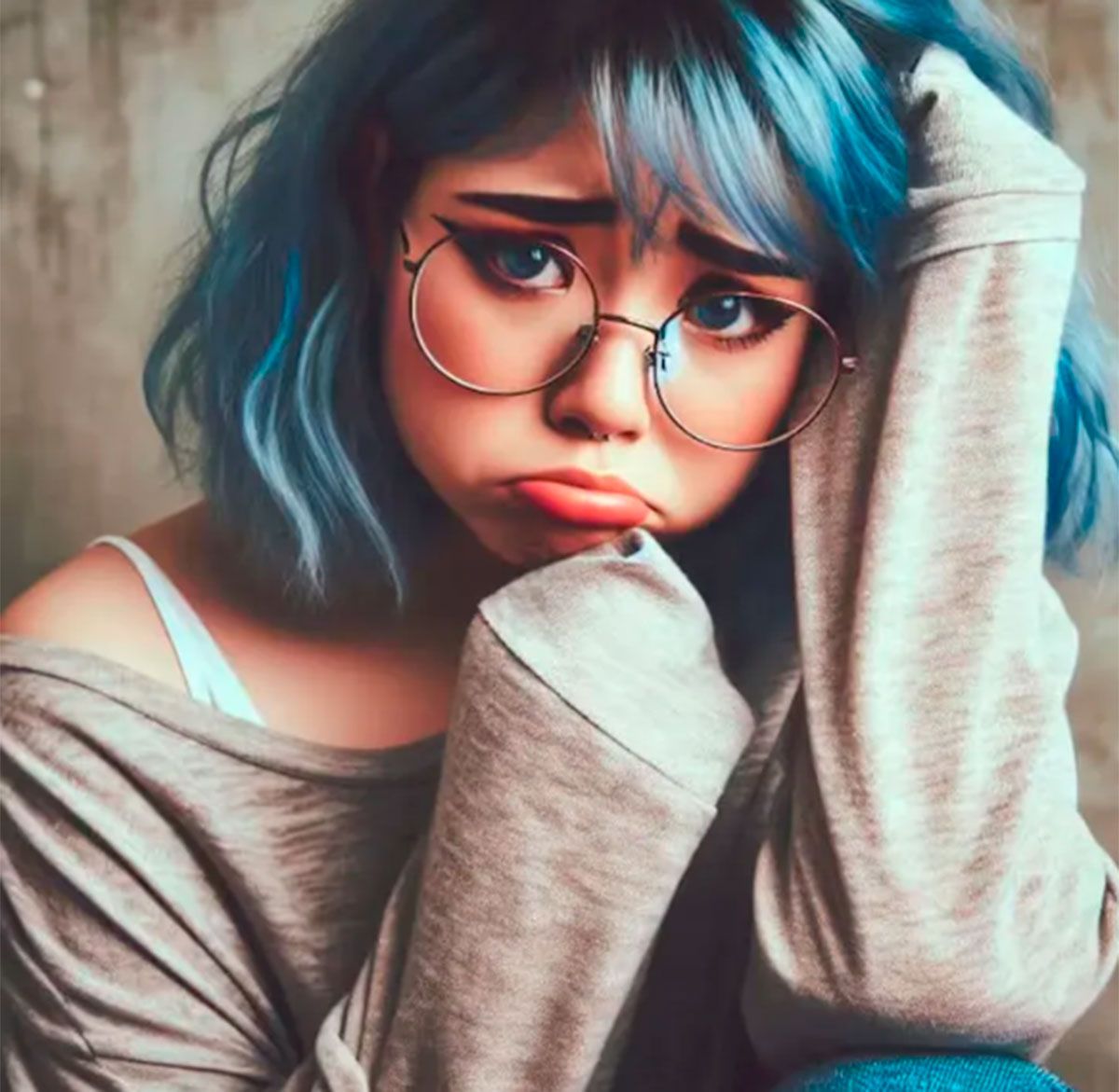 Tristeza es retratada por la IA como una mujer joven con cabello y ojos azules. Muestra una expresión de puchero con la boca y tiene el gesto compungido con sus manos cubiertas por las mangas de su suéter.