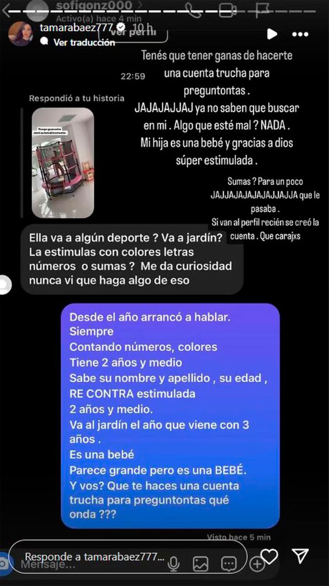 Tamara le respondió, directamente, y luego compartió la captura criticando a esa seguidora. “Desde el año arrancó a hablar. Siempre contando números, diciendo colores. Tiene 2 años y medio. Sabe su nombre y apellido, su edad. RECONTRA estimulada con 2 años y medio. Va al jardín el año que viene con 3 años. Es una bebé, parece grande pero es una BEBÉ. ¿Y vos, que te haces una cuenta trucha para preguntontas, qué onda?”, buscó saber con sarcasmo.