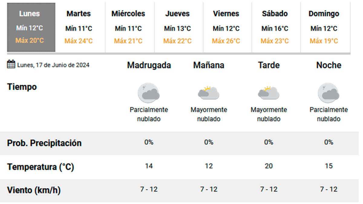 Para el martes, primer día hábil de la semana, se pronostican una mínima de 11 grados y una máxima de 24. Mientras que para el miércoles, último día laboral de esta verdaderamente corta semana, se estima una mínima de 11 y una máxima de 21 grados, con cielo mayormente nublado, similar al de los últimos días.