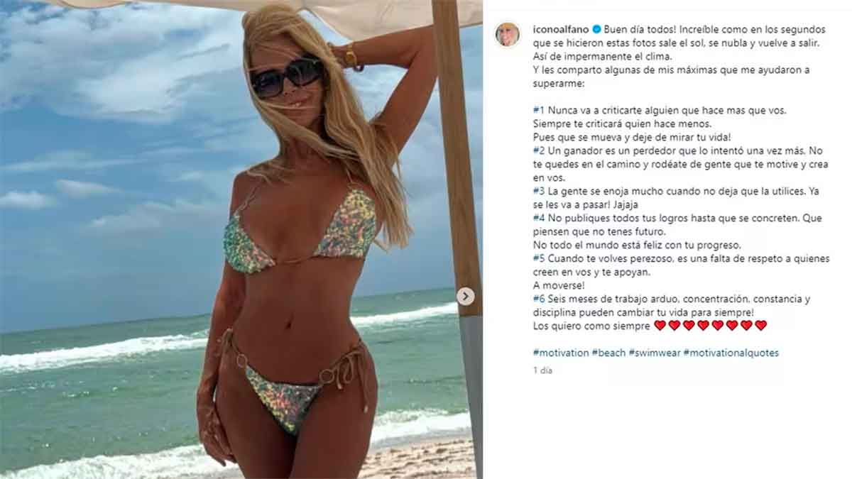 “No publiques todos tus logros hasta que se concreten. Que piensen que no tenes futuro. No todo el mundo está feliz con tu progreso”, agregó la exjurado del Bailando, mientras sumaba otras del tipo “cuando te volvés perezoso, es una falta de respeto a quienes creen en vos y te apoyan. ¡A moverse!”. Y “¡seis meses de trabajo arduo, concentración, constancia y disciplina pueden cambiar tu vida para siempre!”, pormenorizaba, para terminar agradeciéndole a los casi un millón de seguidores. “Los quiero como siempre”, culminó, tras dar sus consejos de vida.