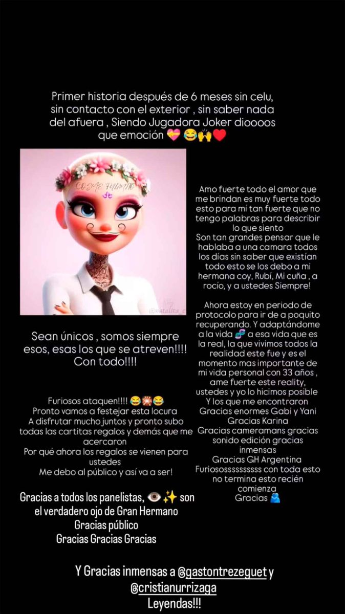 “Primera historia después de seis meses sin celu, sin contacto con el exterior, sin saber nada del afuera, siendo jugadora Joker. Dios, qué emoción”, comenzó su relato la doble de riesgo en su primera comunicación virtual con el mundo exterior tras su salida. Tras ello reveló sus sentimientos al expresar: “Amo fuerte todo el amor que me brindan, es muy fuerte todo esto para mí. Tan fuerte que no tengo palabras para describir lo que siento”.