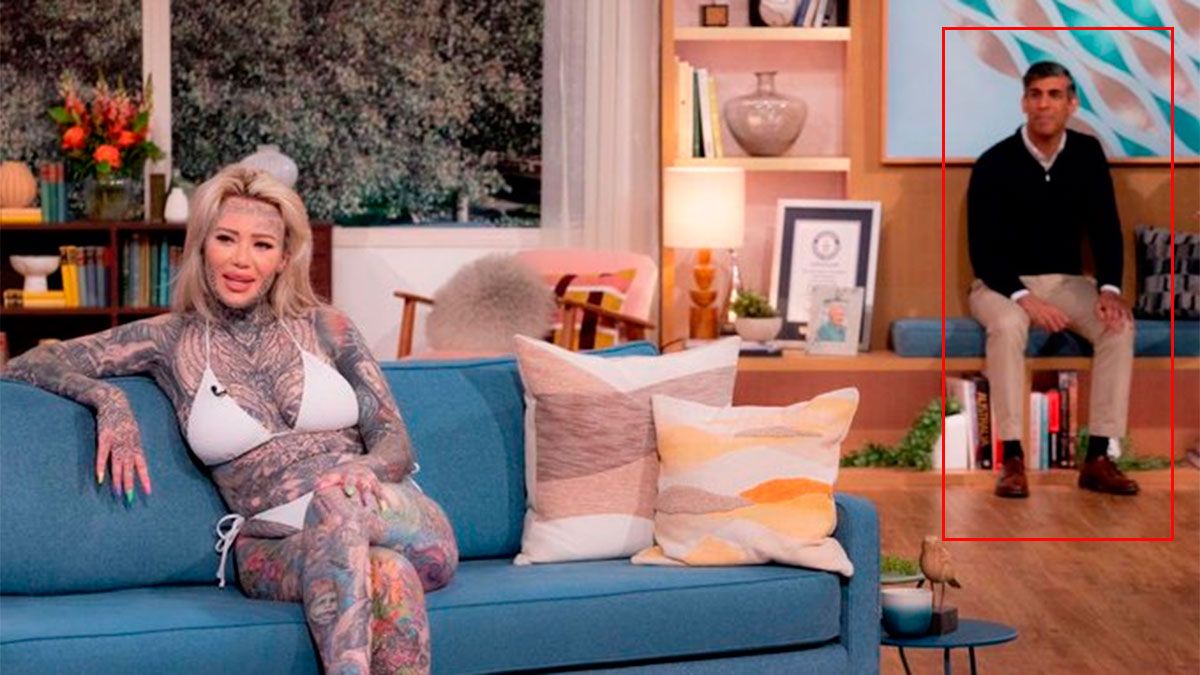 Rishi Sunak, invitado al programa matutino “This Morning”, debió esperar su turno detrás de una modelo de OnlyFans que vestía una diminuta bikini blanca sobre su piel tatuada.