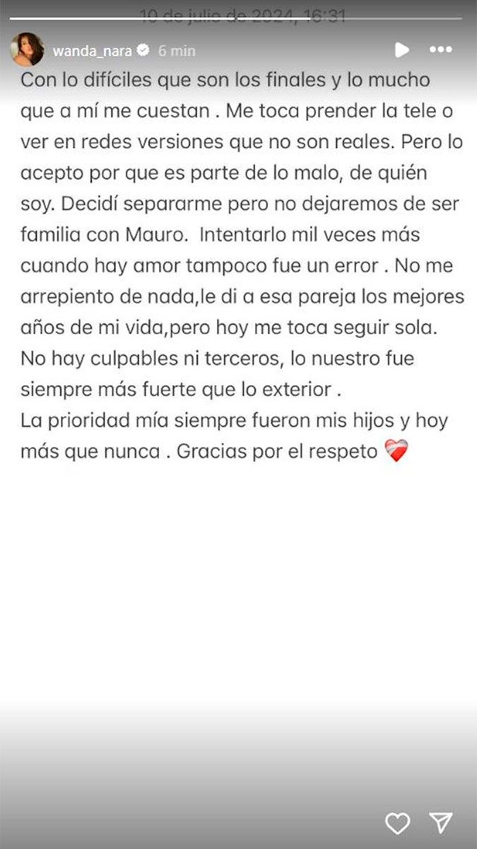 Luego de confirmar que estaba separada de Mauro Icardi, Wanda Nara publicó un sentido descargo en sus redes sociales. “Con lo difíciles que son los finales y lo mucho que a mí me cuestan. Me toca prender la tele o ver en redes versiones que no son reales. Pero lo acepto porque es parte de lo malo de quién soy. Decidí separarme, pero no dejaremos de ser familia con Mauro”, escribió la empresaria en sus historias de Instagram.