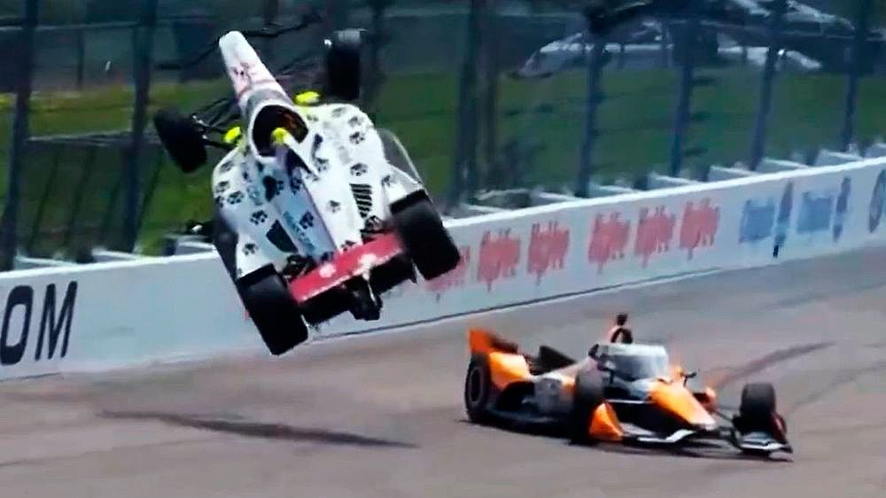 La IndyCar completó su doble fecha en Iowa con un impactante accidente en la segunda carrera del domingo, que involucró a cuatro pilotos. Uno de los vehículos voló y terminó sobre otro, salvando al piloto gracias al Aeroscreen. El argentino Agustín Canapino tuvo fallas mecánicas tras un trompo y finalizó en el 25º puesto.