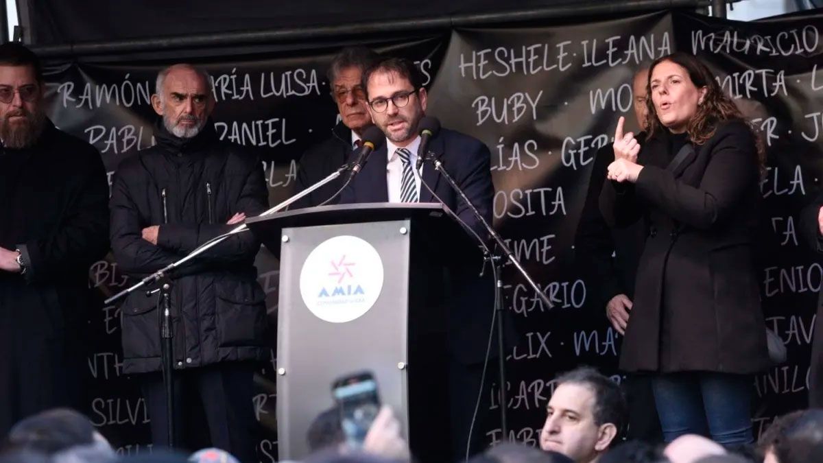 El presidente de la AMIA, Amos Linetzky, dio hoy un fuerte discurso en el acto al cumplirse 30 años del atentado que sufrió la mutual judía. El dirigente reclamó al Congreso y a la Justicia que avancen en las leyes y las investigaciones que permitan esclarecer el hecho a la vez que reclamó que la causa AMIA sea “una cuestión de Estado”.