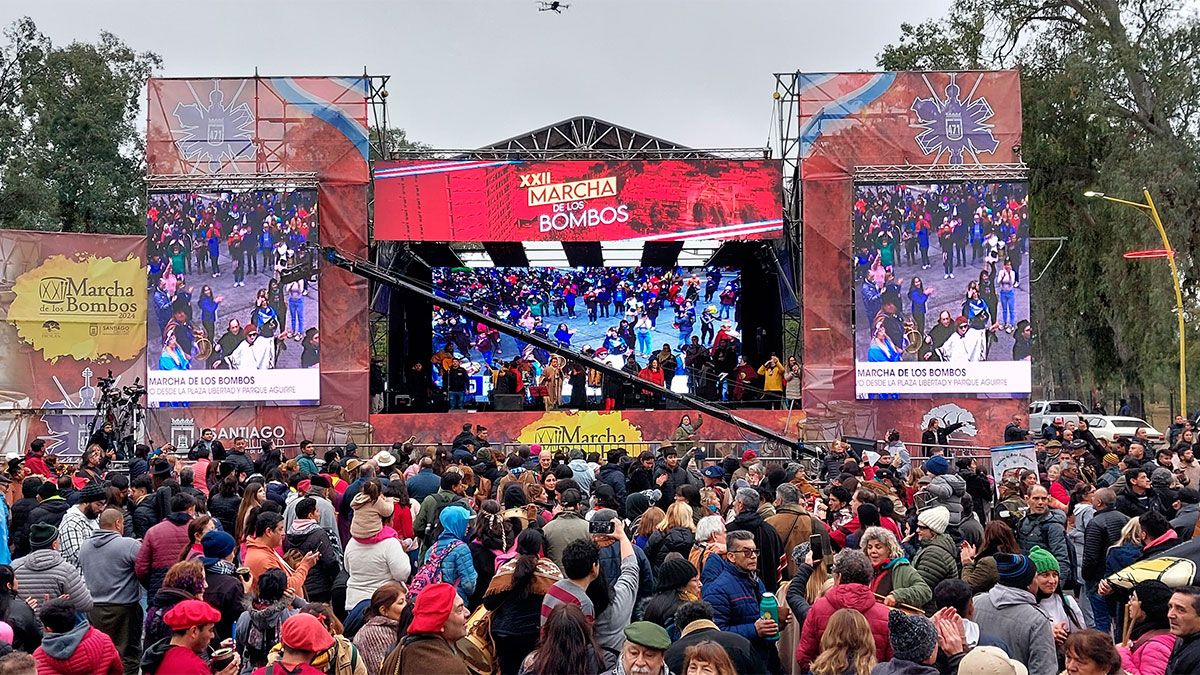 La Marcha de los Bombos reúne a miles de almas en la plaza Libertad, donde los artistas deleitan con sus éxitos.