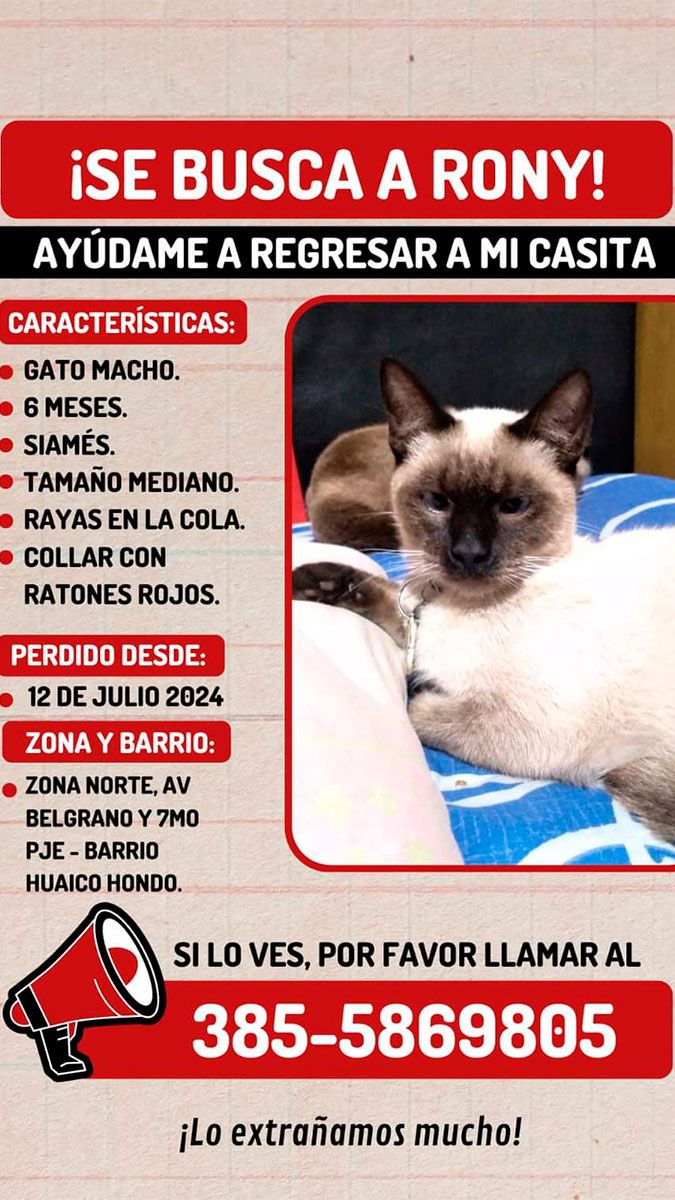 Rony es un gato siamés de 6 meses y tamaño mediano. Se perdió en el Bº Huaico Hondo en Av. Belgrano y 7ma ampliación.