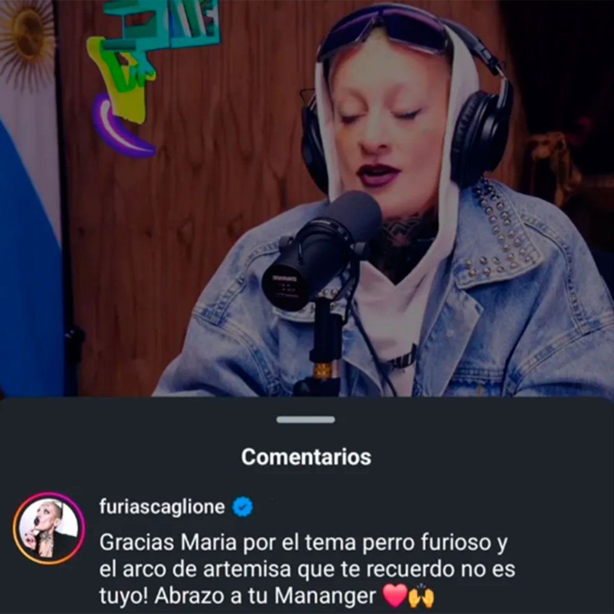 Y la historia no terminó allí, sino que Scaglione confirmó sus delirios de grandeza en Instagram. A través de un comentario en este video, Furia señaló: "Gracias María por el tema Perreo Furioso y el Arco de Artemisa, que te recuerdo no es tuyo. Abrazo a tu manager".
