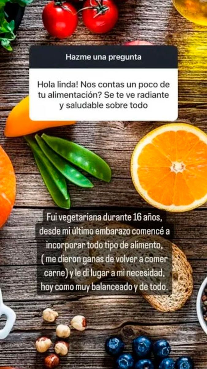 “¡Hola, linda! ¿Nos contás un poco de tu alimentación? Se te ve radiante y saludable, sobre todo”, consultó una follower. “Fui vegetariana durante 16 años, desde mi último embarazo comencé a incorporar todo tipo de alimento (me dieron ganas de volver a comer carne) y le di lugar a mi necesidad”, reveló sobre la llegada de Bono, su cuarto hijo.