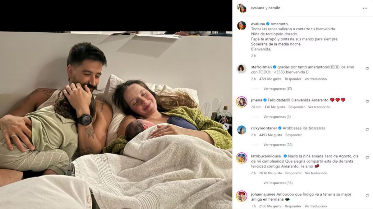 En las últimas horas, Evaluna y Camilo anunciaron el nacimiento de su hija Amaranto con un tierno posteo en redes sociales. La noticia fue celebrada por sus seguidores, quienes le dejaron palabras llenas de cariño, buenos deseos para la familia, y de bienvenida para la nueva integrante de la familia.