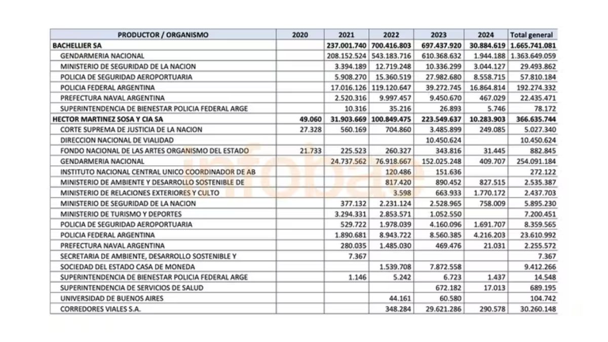 Un auditor de Nación Seguros declaró ante la Justicia que esa póliza generó comisiones por encima de lo permitido. “Nosotros controlábamos que esté por debajo de los máximos. Siempre se cobró el 10%, salvo Gendarmería que pagaba el 15% hasta mitad de año de 2023 que se bajó al 10% como los demás. Recuerdo que el 12% iba a Bachellier y el 3% a Martínez Sosa”, sostuvo ese testigo.