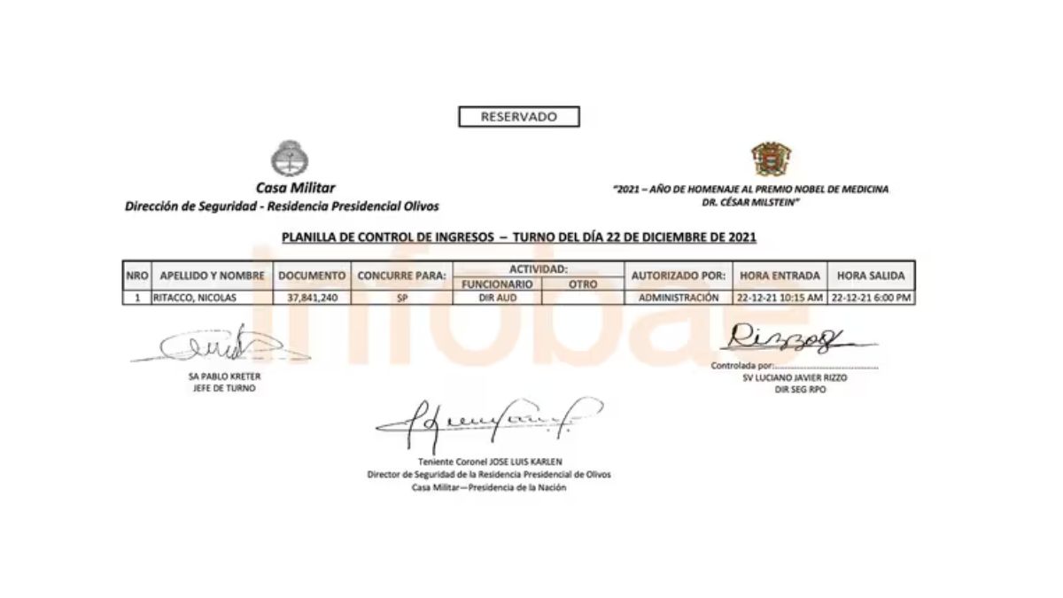 La visita, si efectivamente se concretó, nunca apareció en los registros oficiales. En cambio, sí figura el ingreso de Nicolás Ritacco, uno de los secretarios de Fernández, a las 10:15 AM.