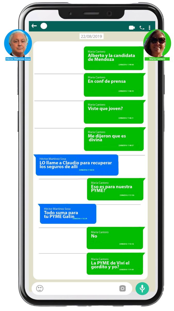 Una semana después, otra vez hablan de negocios. “Lo llamé a Claudio para recuperar los seguros de allí”, dice Martínez Sosa en relación a un supuesto contrato en la provincia de Mendoza. “Eso es para nuestra PYME?”, pregunta Cantero. “Todo suma para tu PYME Gatin”, le contesta su marido.