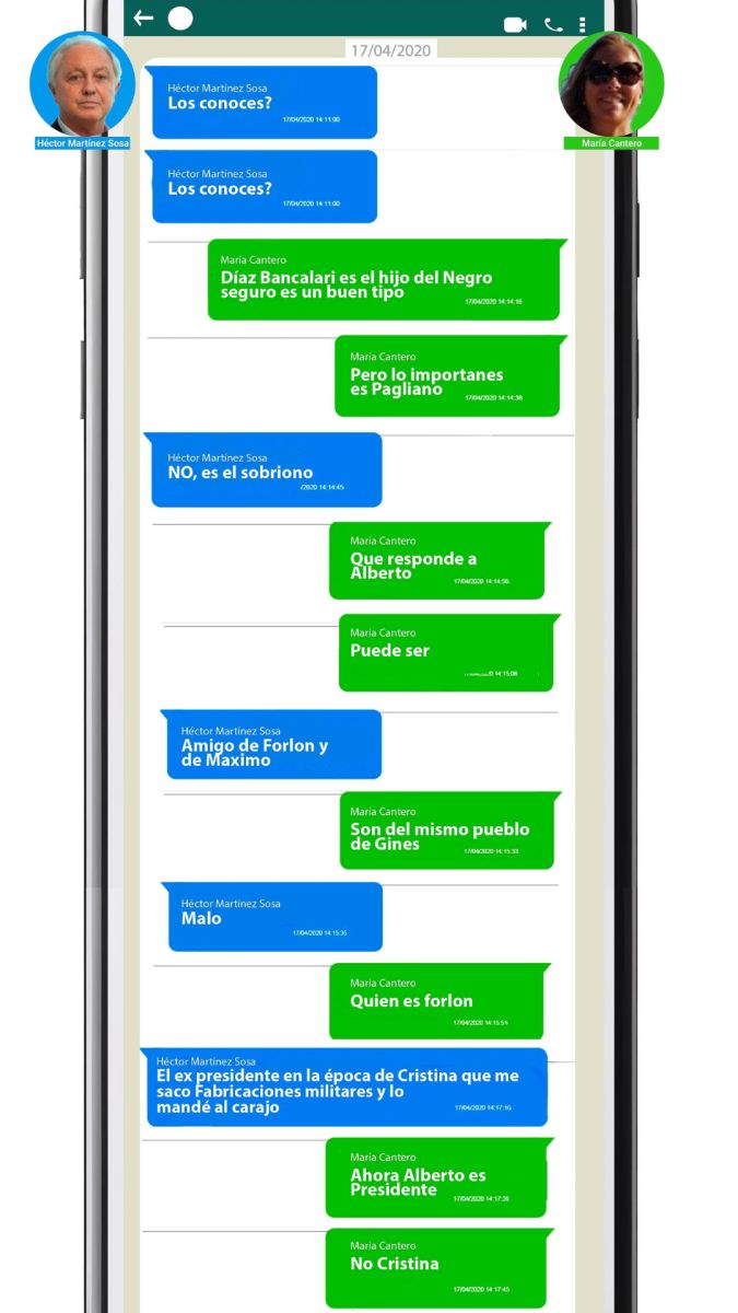 La conversación continúa. Aparece el nombre de Ignacio Forlón, un ex integrante de la Auditoría General de la Nación cercano a Máximo Kirchner. “Me sacó Fabricaciones Militares y lo mandé al carajo”, le recuerda Martínez Sosa a su mujer. Cantero sostiene que los tiempos cambiaron: “Ahora Alberto es Presidente. No Cristina”.