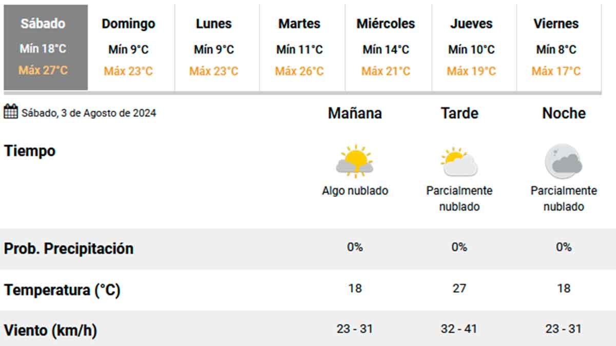 La máxima de este sábado, el primero del ventoso mes de agosto, alcanzará los 27 grados y el cielo se mantendrá parcialmente cubierto. La presencia de viento del sector sur haría que hacia la noche los registros bajen paulatinamente y para el domingo se esperan una mínima de 9 y una máxima de 23 grados.