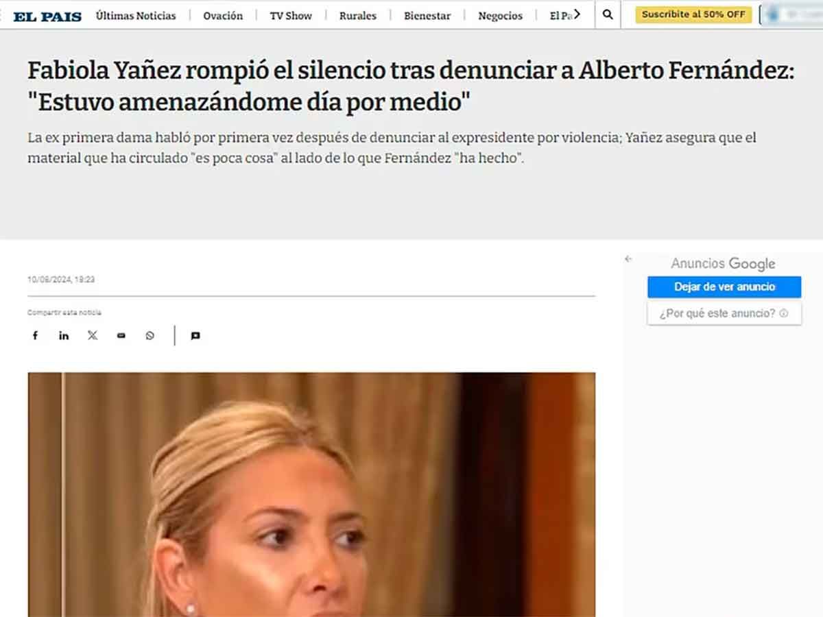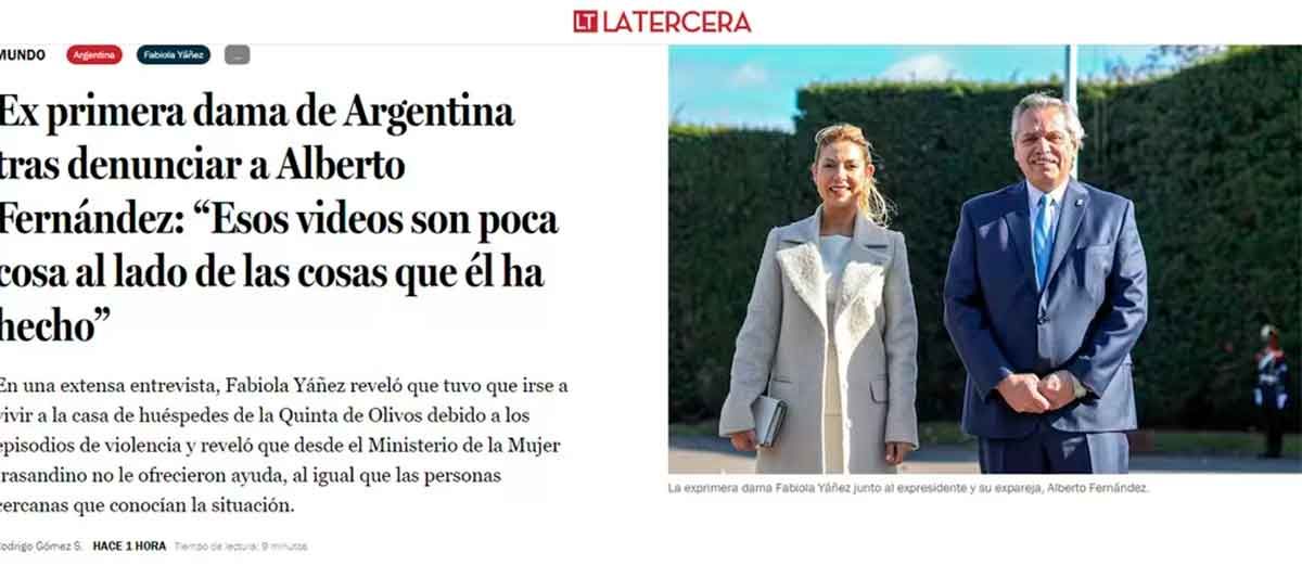 La extensa entrevista exclusiva de Infobae con Fabiola Yañez tuvo una gran repercusión en la prensa del mundo. Luego de que ratificara una denuncia penal en contra del ex presidente argentino Alberto Fernández por hechos de violencia de género que habría sufrido durante la anterior gestión, la ex primera dama reveló detalles sobre las peleas, las infidelidades, la indiferencia impartida por ex funcionarios públicos y el tiempo que pasó recluida en la Quinta de Olivos.