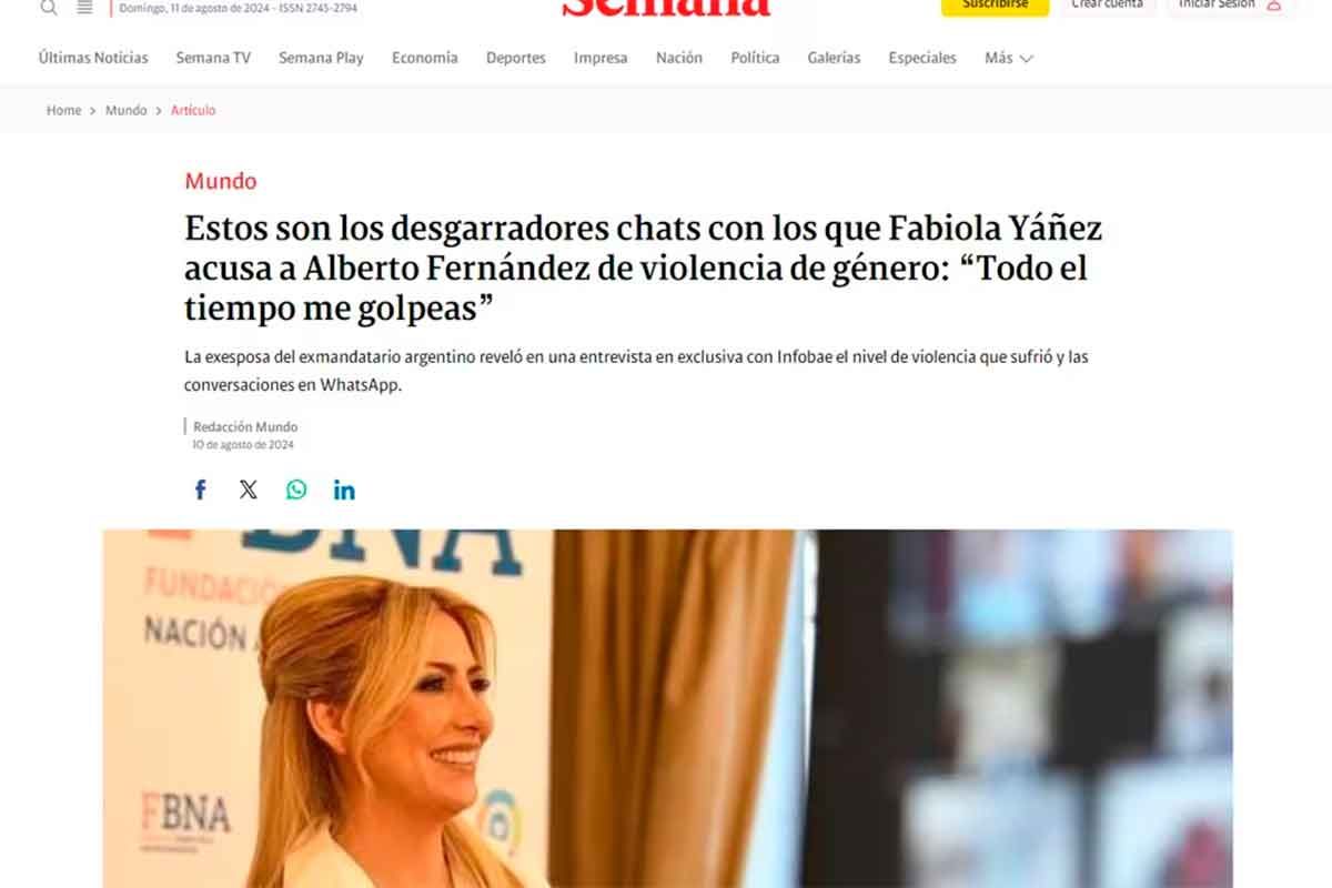 En el caso del medio colombiano Semana, éste mencionó la conversación que fue publicada a las 20 horas del 10 de agosto -horario argentino-, más optó por reflotar las imágenes exclusivas a las que tuvo acceso Infobae sobre los chats que Fabiola mantuvo con Fernández. En las capturas difundidas, la mujer le recriminó en varias oportunidades sus malos tratos y golpes propinados.