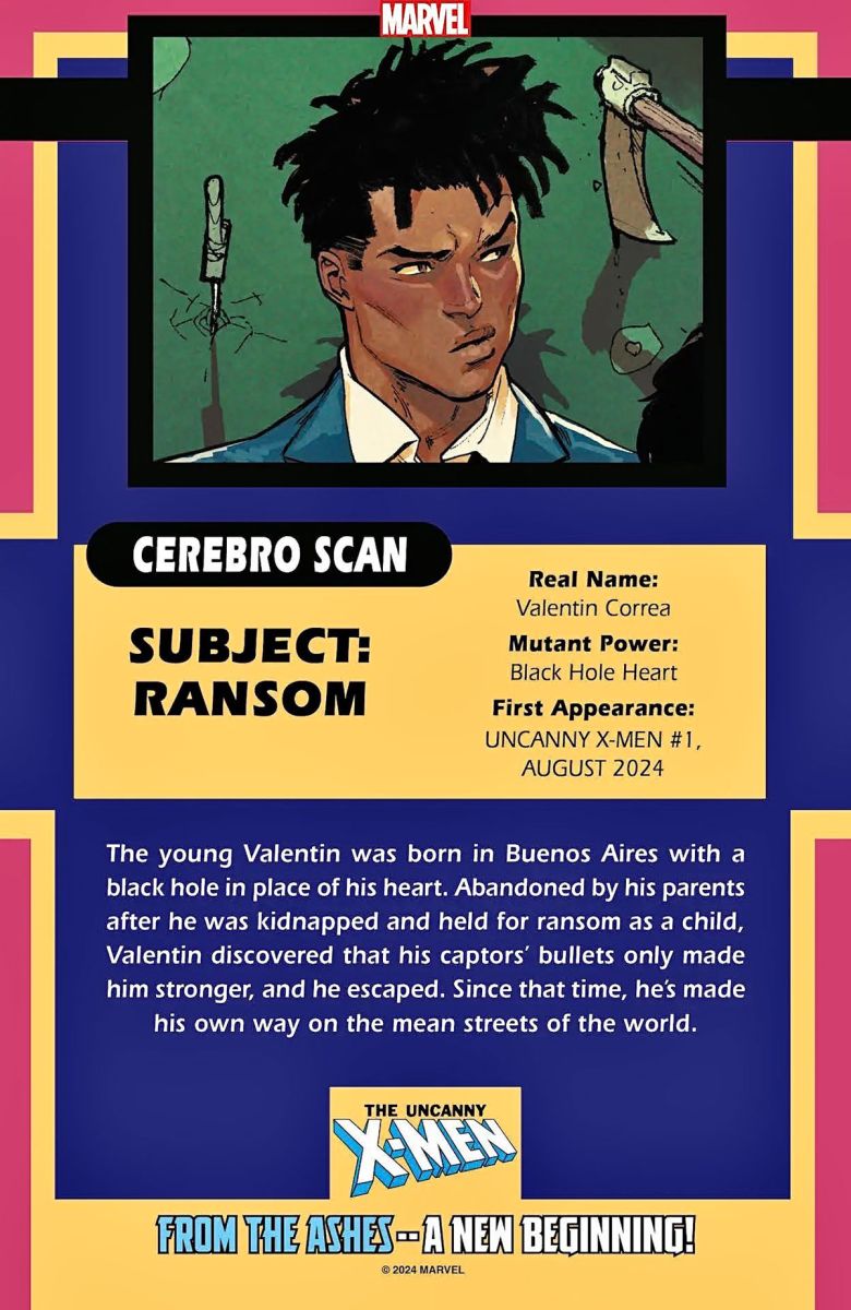 "Desde ese momento se ha abierto camino en las malas calles del mundo", concluye la escueta biografía de Valentín, que aparecerá junto a otros X-Men nuevos en el número 1 del relanzamiento. Valentín Correa todavía ni siquiera se encontró con el Profesor X y ya está dando de qué hablar.