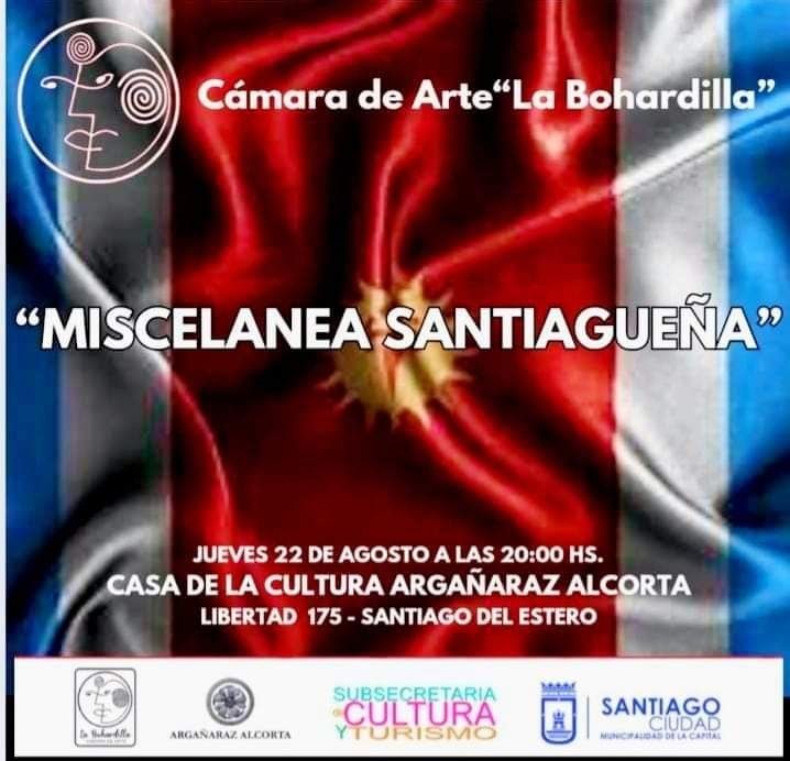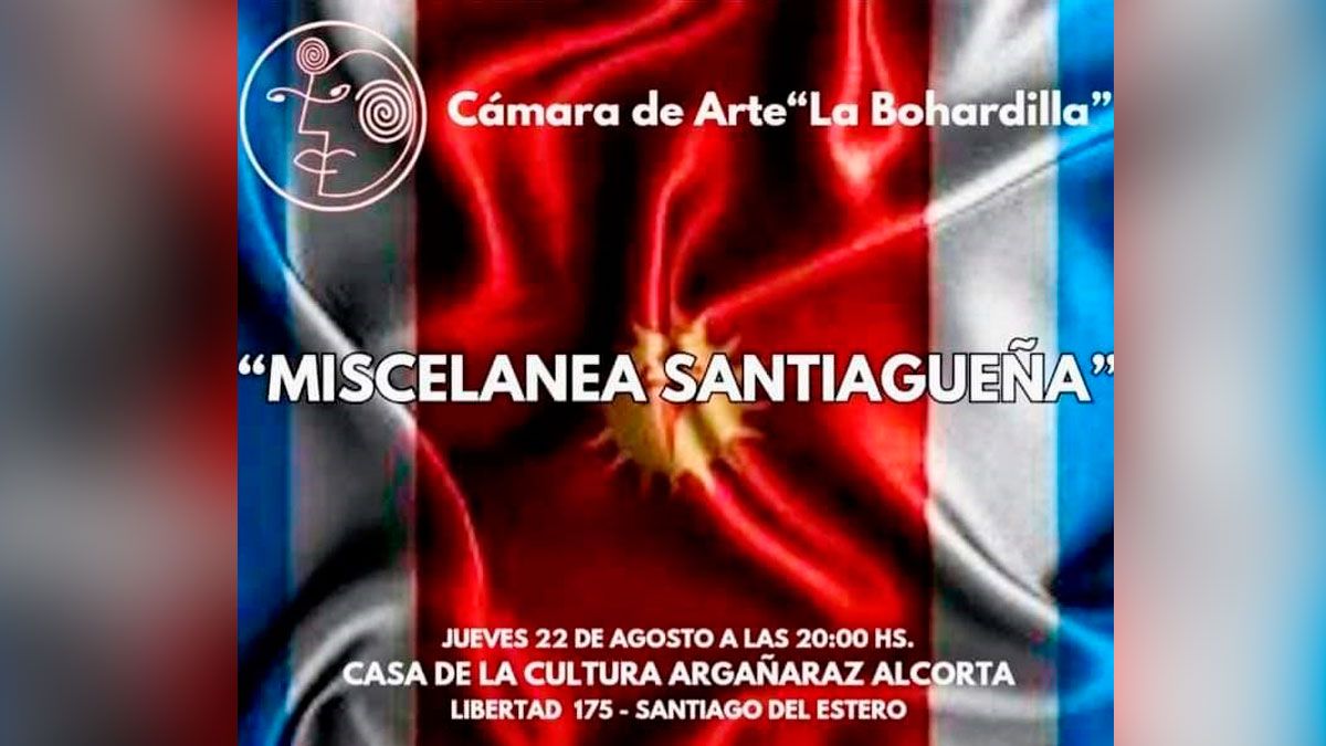 La inauguración de la muestra “Misceláneas santiagueñas”, organizada por la Cámara de Arte “La Bohardilla”, tendrá lugar el día 22 de agosto a las 20 horas, en la Casa de la Cultura Argañaraz Alcorta (Libertad 175).