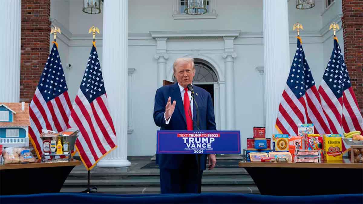 En ese campo de golf, Trump compareció ante la prensa con varios productos típicos del desayuno estadounidense: panceta, café y galletitas. La idea era remarcar lo mucho que esos alimentos se han encarecido, con gráficos adjuntos sobre sus precios, aunque el ángulo de las cámaras de televisión solo permitía mostrar al expresidente junto a lo que parecía su compra de la semana.