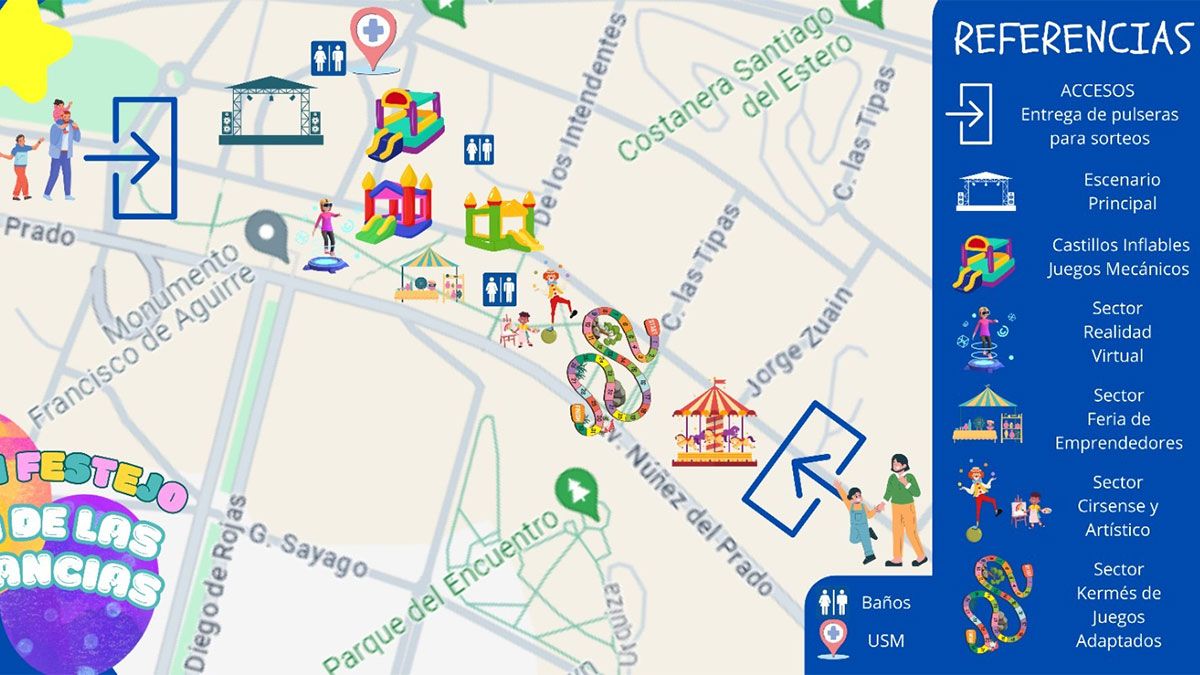 El área de kermés y de los Juegos adaptados estará situada sobre calles Mujica y Las Tipas, en el estacionamiento del Parque de los Niños. Mientras que, el espacio circense, será habilitado en el Parque de los Niños, a la altura de calle Los Intendentes.