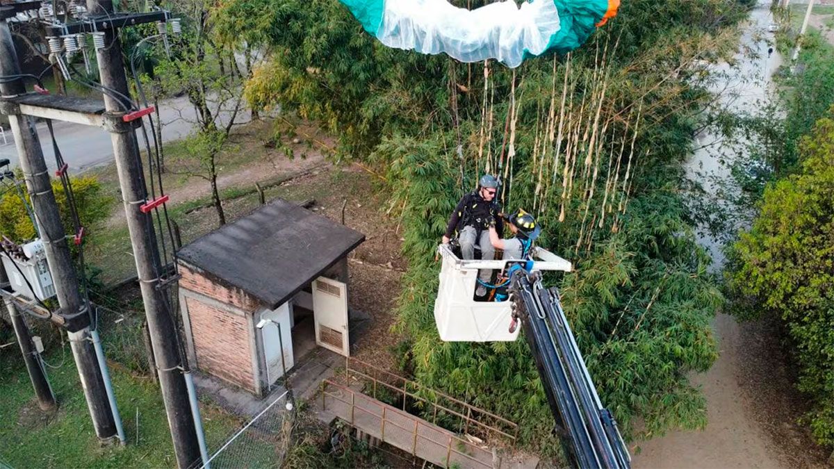Un hombre que volaba en parapente se desvió del camino y terminó enredado entre cables de alta tensión en la entrada de un country. Afortunadamente, luego de varios minutos, los bomberos voluntarios de la zona lograron rescatarlo ileso.