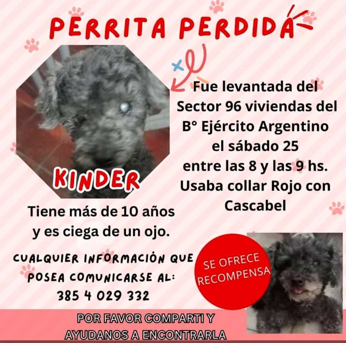 El sábado 25 de junio, entre las 8.00 y las 9.00 horas, se reportó la desaparición de Kinder, una perrita de más de 10 años que es ciega de un ojo. La perrita llevaba un collar rojo con cascabel y fue vista por última vez en el sector 96 viviendas del Bº Ejército Argentino.