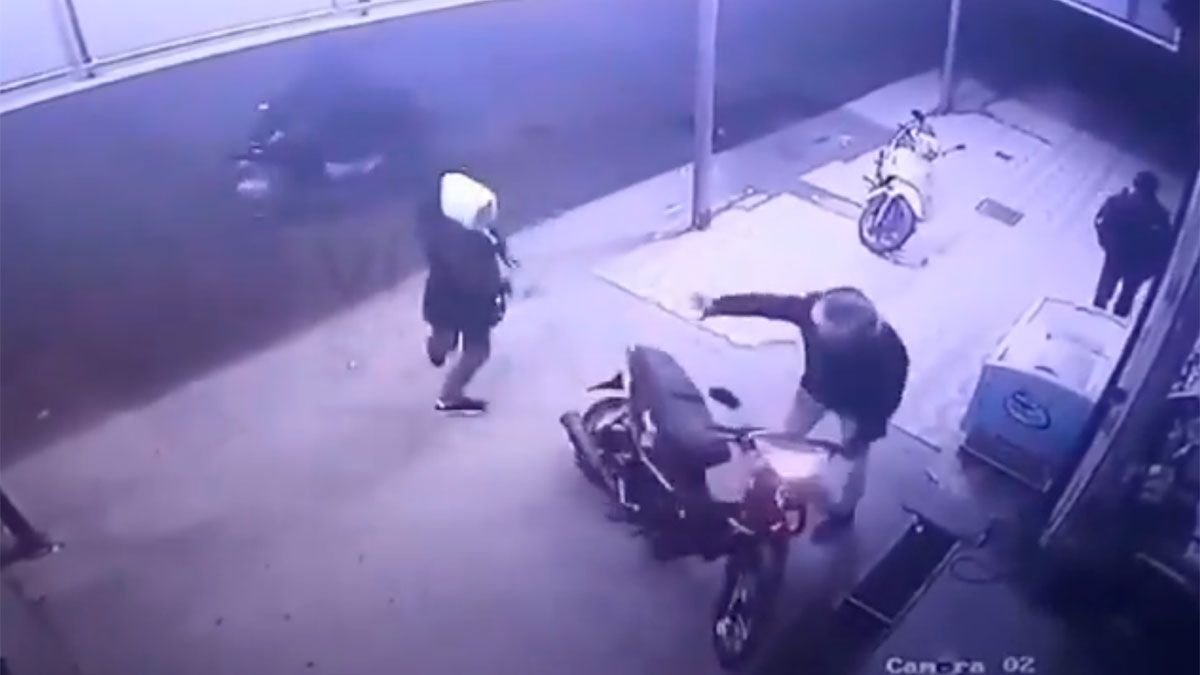Todo sucedió frente al local ubicado en la avenida Alvear, a donde llegó Ramírez, en una Zanella ZB roja. Las imágenes, que son nítidas, lo muestran con una bolsa en la mano, en la que lleva un objeto. En el momento en el que está bajando, es sorprendido por los dos ladrones, que también llegan en moto.