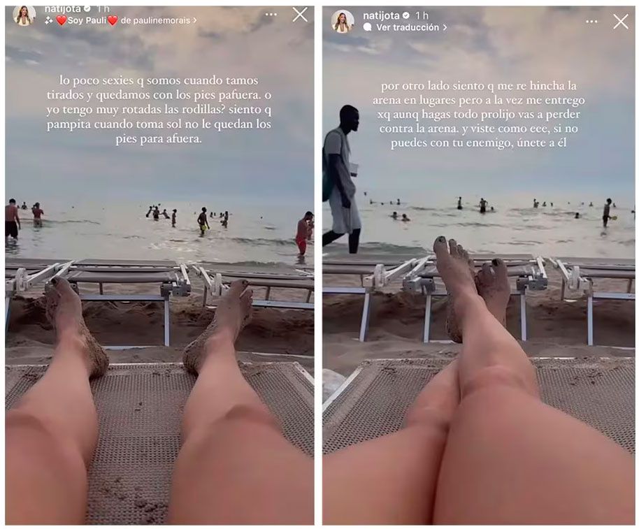 A pesar de sentirse contenta y relajada en su llamativo destino, la joven no pudo evitar hacer una profunda reflexión, la cual compartió con sus seguidores. La misma estaba relacionada con una de las inseguridades que siente con una parte de su cuerpo, especialmente cuando decide tomar sol en una reposera. “Lo poco sexies que somos cuando estamos tirados y quedamos con los pies para afuera”, comenzó escribiendo la periodista.