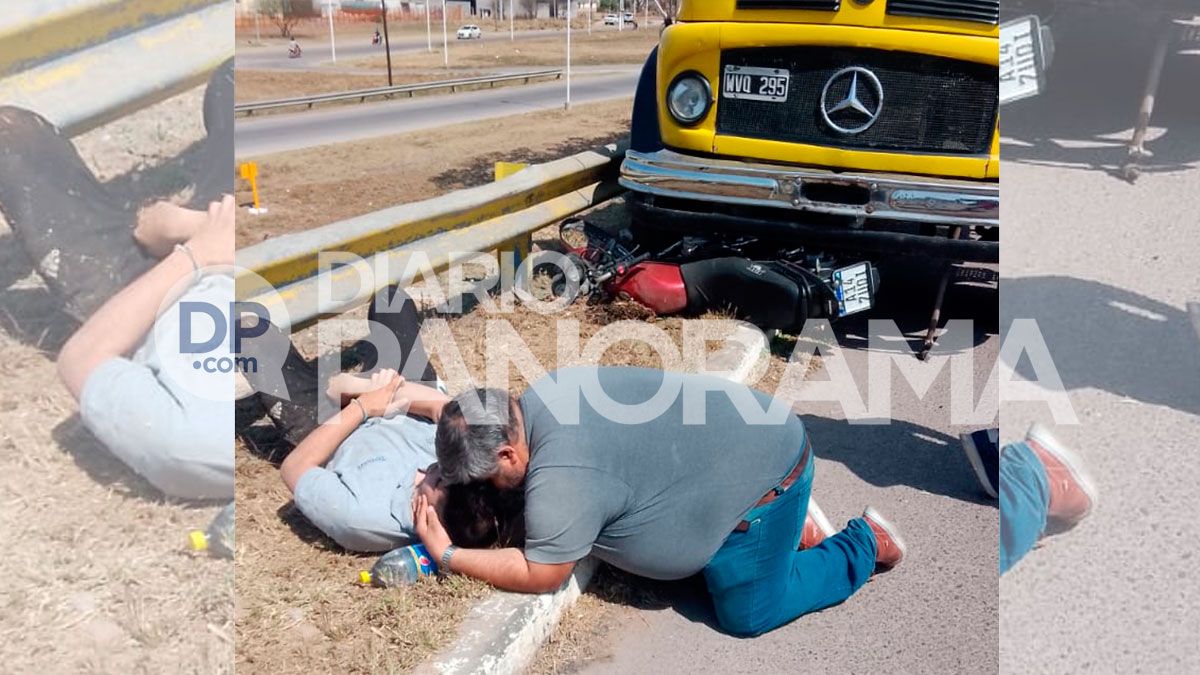 El rodado menor quedó debajo del camión y las personas sufrieron heridas de gravedad.