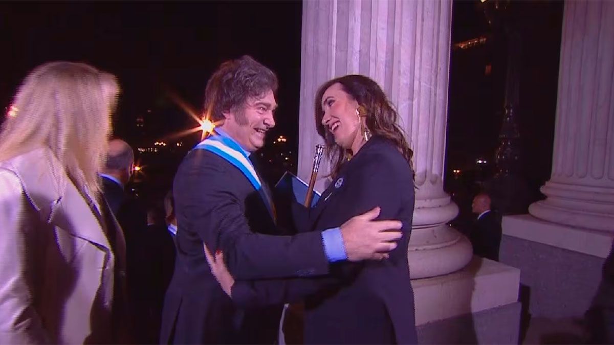 Al lado de la vice también estaba el titular de la Cámara de Diputados, Martín Menem, a quien Milei también saludó con un gran abrazo, le dio tres palmadas en la espalda y le dirigió unas breves palabras.