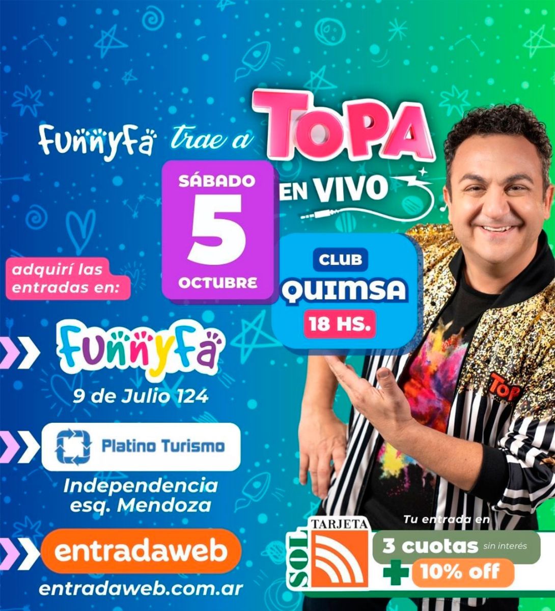 Diario Panorama, junto a nuestros amigos de Tarjeta Sol, te invitan a participar de un espectacular sorteo para disfrutar del show del famoso ídolo infantil, Topa. El evento será el sábado 5 de octubre a las 18 hs en Quimsa, y promete ser una experiencia inolvidable para grandes y chicos.