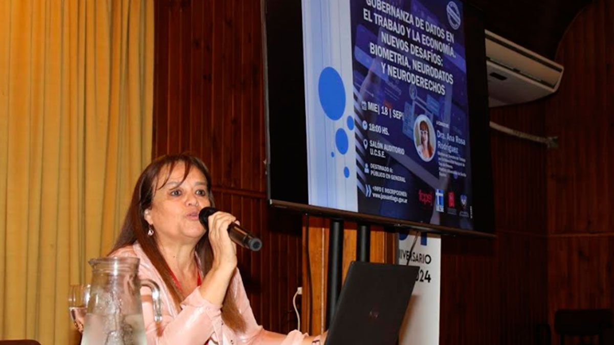 El Salón Auditorio de la Universidad Católica de Santiago del Estero (UCSE) fue el ámbito donde la Dra. Ana Rosa Rodríguez, vicepresidenta segunda del Superior Tribunal de Justicia, disertó sobre, "Gobernanza de datos en el trabajo y la economía. Los nuevos desafíos, biometria, neurodatos y neuroderechos".