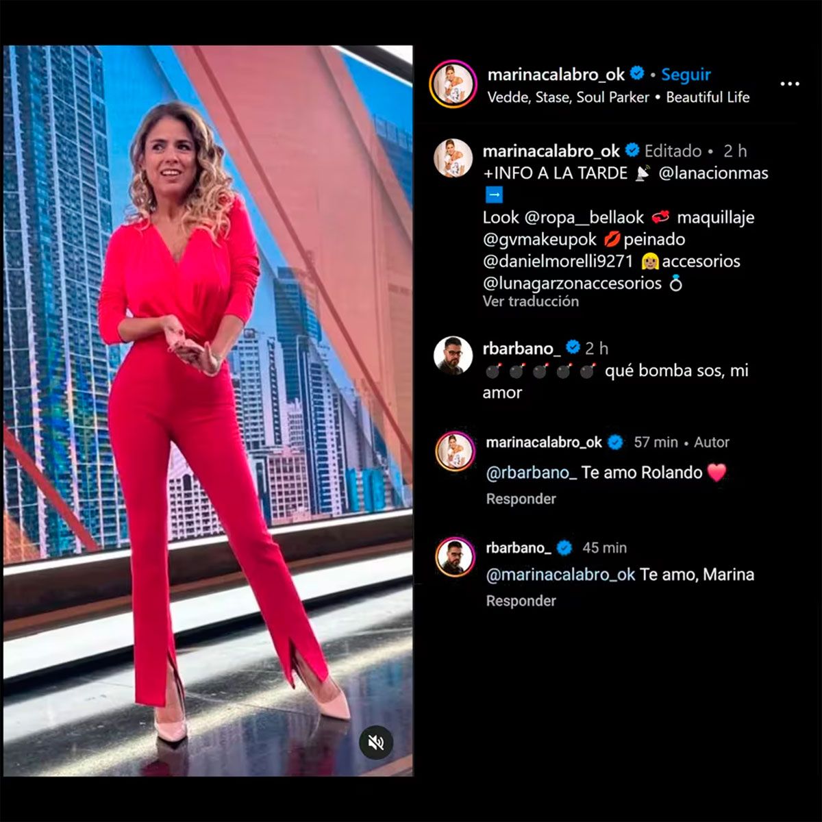Luego de que Calabró publicara un video, en el que lucía su look para uno de sus programas, Barbano comentó junto a emojis de explosión: “Qué bomba sos, mi amor”. Minutos más tarde, la respuesta no tardó en llegar. “Te amo Rolando”, escribió la menor de las Calabró, a lo que el comunicador devolvió: “Te amo Marina”. De esta manera, ambos dejaron en claro que ya no temen mostrar abiertamente su relación en redes. Inmediatamente, los fans de la periodista apoyaron las palabras del especialista en policiales.